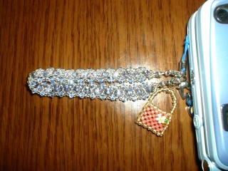 ・これは本当はついていた特別の金具で、かばんのもち手のような感じに携帯に付けられるのですが私は他のも付けたいので、こんな感じの付け方をしています。銀の丸小とチェコビーズの紫スワロの水色の色の組み合わせがすごく気に入っています。 ・キット Beads Mania