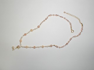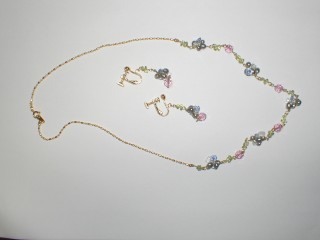 ・ガラス玉や、パール、パールをキューブに編んだもの9ピンでつなげてあります。ネックレスの後ろ半分は2本のテグスにチェコ3o他の通して編んであります。トップはパールとかをワイヤーで巻きつけたもの。全体にオレンジの柔らかな色でまとめてみました。