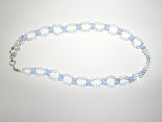 ・これは雅子様が作ったといわれているネックレスに近いけど、ちょっと違う作品です。水色のビーズの真ん中に2oのビーズが入っています。TVで見て作ってみて、後でどこかのビーズショップで、雅子様のネックレスの作り方が掲示してあるのを見たら、作り方が全然違ってたという。