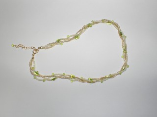 ・素材 淡水パール、チェコ、スワロラウンド5o、水晶とペリドットのさざれ、鎖、留め金一式、他