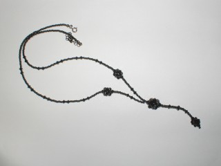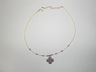 ・これはネットで、キットを通販して作りました。一目で気に入って申し込んだのですが、とっても気に入ってます。鎖の部分はナイロンコードワイヤーを使っています。モンタナとタンザナイトのスワロを使っています。こういう色好きなんですよねー。