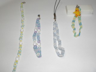 ・これは上の奥の指輪とおそろいでもあります。左から1つ目と、3つ目がそうです。左から1つ目はアンクレットです。夏にサンダルを履いたときにいいかなーと、作ってみました。2つ目は色会いが気に入ってずっと鍵のストラップとして使ってたものです。4つ目はビーズが、マットタイプで、ひよこつきです。どうしてこの組み合わせにしたのかは覚えてないんですが、娘の受けを狙って作りました。