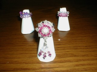 ・奥の2つは見にくいですが、花のモチーフを編んだものです。中央左、はっきり写ってないんですがクリスタルのスワロと、透明丸小ビーズで作った、立爪風の指輪です。中央右は、ラウンド型のスワロの両脇に金色のロンデルを置いて、あとはジェットのスワロや丸小ビーズを編んであります。手前は、チェコやスワロで、花のイメージで指輪にしてみました色合いは気に入っているんですが、写真でははっきりしませんねー。