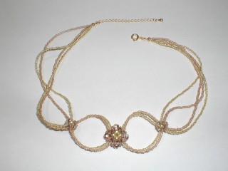 ・これは、ブレスレットのキットだったのですが、ブレスレットはあんまり着けないので、チョーカーにしてみました。鎖の部分はビーズが足りなかったので買い足しました。中央の花のモチーフと、両脇のリング型のモチーフがかわいくて気に入ってます。色合いも、ゴールドと、落ち着いたピンクで派手になり過ぎなくていいんじゃないかな。 ・キット ロマンティックアクセサリー(トーホー)