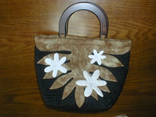 ・去年くらいに買ったキットです。すぐに作りたかったのですが、いろいろあって、今頃作ることに。ハワイアンキルトは好きなのですが、原色はあんまり好きではないのでついこんな色合いを選んでしまいます。木とか布以外の素材の持ち手を付けるのは初めてで気に入っています。ボタンで付けられるようになっているので洗う時はずせます。葉っぱのデザインも気に入っています。花はジャスミンのつもり。