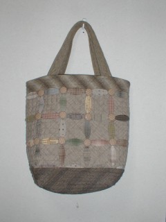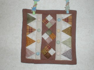 ・すっごく気に入って通販したキット。ボタン使いが気に入ったポイントなんだけど、ピースワークが曲線で、曲線は初めての挑戦で結構大変だった。キルティングも結構細かかった。持ち手もキットにセットされていたものと布も変えて、長くして肩にかけられるようにした。カントリーカラーが気に入っているし、こうした布をちょっとずつそろえるのも大変なので、このキットがあってよかったなあと思う。