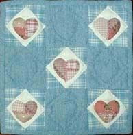 ・ミニキルト交換会用に作った作品。クレイジー風のハートちょこっと刺繍も入れました。優しい色合いを意識して作った作品です。