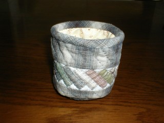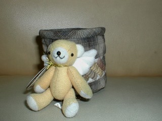 ・ランチョンマットと同じデザインを使ってみました。1p幅なので非常に細かいです。サイズ自体も小さいので、縫うのに時間はかからないんですが、縫いにくかった。色合いはカントリー調。反対側に実は市販のくまのマスコットが縫い付けられています。