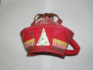 ・クリスマスの色合いとデザインのポーチです。「COTTON TIME」で見て気に入ったので作ってみました。形がティーカップなので、底のところが布がずれやすくて苦戦しました。可愛くって気に入っています。紐のところのボンボンも可愛いですよね。