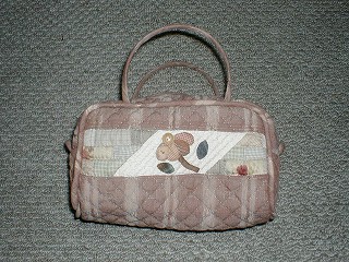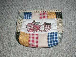 ・これは本当に時間をかけて作りました。じっくり作ったということもありますが、急ぎのものが入って手をつけない時間が間に入っているせいです。あと、パイピングコードとか、ループの飾りとか、もち手も中に芯を入れるという凝った作りだし。キッカーズキルトクラブのキットです。吉川欣美琴さんのパッチワークがすごく好きで、このキットを買ったんですが、思い入れがある分なかなかささっとできなかったんですねー。作ってみたら、やはりいいなあと感じました。暖かで易し優しい色使いとか、内側の仕立ての細やかさとか。まあ、私が作ったので、吉川さんの本当の作品みたいにきれいじゃないんですが。また、キッカーズクラブのキットで何か作ってみたいです。