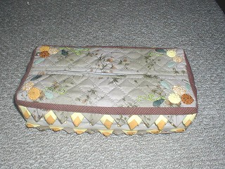 ・とにかく苦戦した作品です。側面の花のつぼみがそろわないんですもん。何とかそこをクリアしたら、今度は縫い代が重なって布が厚くなって縫えないし。キルティングはきっちり丁寧にできた気がするんですけどねー。升目のゆがみが少ないし。あ、側面にビーズもつけました。交換会に出展したんですが、いいのかなあ。気に入っていただけるといいんですが。