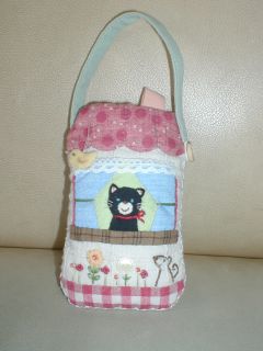 ・素材 木綿、キルト芯、他 小さいけど、結構あちこち刺繍や細かい細工が入っています。ベアーズ・ポーのキットなんですが花やねずみや魚の刺繍が入っているところと、かわいいねこがお気に入り。とりさんは糸でぶら下がっているので、ぶらぶらしてかわいいです。