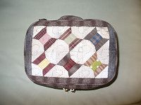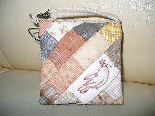 お正月にMDウォークマンを購入したのでそのケースです。使い勝手はまあまあかなあ?直したい点もあるけど、我慢できる範囲。ポケットがなくてもズボンのベルト通しにかけたりできるし、カバンのもち手にかけておけば、探さなくてもすむのがお気に入り。鳥の模様は小枝チョコのお徳用パックの小袋のイラストを参考にしました。パッチワークに使った布は余り布。ほとんどお金がかかっていない作品であります。