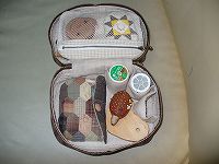 これはお友達にレシピを紹介してもらいました。ソーイング仲間で同じソーイングケースを作ろうと話しています。糸巻きのパターンが気に入っています。中は収納がたくさん。コルクボードに、サンドーペーパーを貼り付けた、型紙を写すときの下敷きも入れてあります。まちを深くして、糸巻きをつけるところを紐ではなくポケットに変えちゃっています。ポケットはみんな大きめに作ってあります。