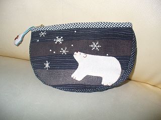 一目見て購入してしまったキットです。またもやベアーズ・ポーさんのもので、雪の結晶の刺繍がポイントでしたね。ファスナーの飾りは両側熊の足あとでしたが、青い方には雪が合うと思って勝手に雪に変えています。これは手元に届いてから完成まで3日というあっと言う間に仕上がった作品であります。