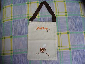 ・素材 木綿、他 ・これはバックはすでにできていて、ステンシルをして持ち手をつけただけです。ステンシルは色を混ぜて作って、付いてきたシールを布に貼ってぺたぺたとスポンジで色をつけただけなのでとっても簡単。でも、ちょっと小さくて、何に使おう??