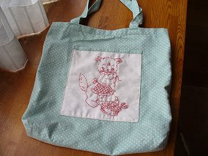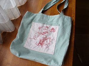 ・素材 木綿、他 ・刺しゅうにハマって作ったバックです。猫の刺しゅうの図案がとてもかわいくって、刺しゅうが苦手なくせにがんばりました。裏表違う図柄になっています。春なので普段使わないポップな布を使ってみました。