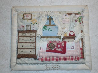 ・縦19p横22p程度の小さいものです。何かのカタログにあったものをまねて作ってみました。もとは大きなサイズで、小さいのが作りたくて半分以下のサイズに縮小しました。ミニチュアといってもいいかも。箪笥の上のかごの中には、裁縫道具。アルミホイルで作った、小さなハサミは苦心の作です。花瓶の花とか、とにかく小さいので、布にほつれ止めの薬をしみこませてほつれなくしてから切り取って縫い付けました。ベッドの上のキルトの布団も小さなパーツを実際に縫い合わせて作るなどちょっと凝ってみました。
