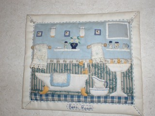 ・素材 木綿、キルト芯、他 ・上と同じシリーズで、こちらはバスルーム。小花の模様を使って作ったタイルが気に入ってます。水道のコックも花の模様でそれらしくしてあります。シャワーのホースも布を丸めて立体的になっています。こちらもかなり細かいパーツをちまちまと縫い付けた苦心の作です。