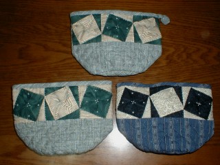 ・これは、緑色っぽいほうはキットで、青いほうがmiuが布を選んで作りました。母の日のプレゼントにしようと思って2つ同じものを。折り紙キルトというだけあって、布を折って、折り曲げたところを刺繍糸で留めてあります。パッチワークしたものより少し立体的。折り紙したところが、かざ車みたいだなあと思っています。キットのほうは、折り紙が生かされるようにストライプ模様で、折ったモチーフがはっきりしていますね。写真で折ってあるのがわかるといいんですが。miuが選んだのは、和風の布。こちらは折り紙が全然はっきりしてないです。なんだかなあ。底布は、丸い形をしています。