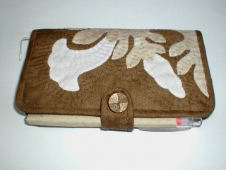 ・写真では横にしておいてありますが、縦15p横8pの手帳です。エンゼルトランペットをモチーフにしています。ソーイングケースのデザインをアレンジして色違いにしてみました。内側にはカードを入れられるポケットが二つつけてあります。
