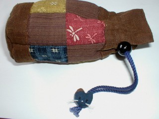 ・ねこが気に入って、キットを買ってしまった作品です。パッチワークの赤や黄色、青の布は、元は違う布がセットでしたが渋いので、変えてしまいました。上下の茶色い布は、柿渋染めだそうです。麻のように太い繊維でできていて、はじめは硬かったのに、縫っているうちに、手になじむような柔らかさになりました。