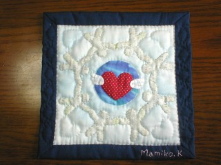 ・反戦ハートキルトに参加するために作った作品です。世界の人々が、武力ではなく、話し合いで心をひとつに出来たらと、祈りを込めて作りました。色彩的には、失敗したかなーと思ってます。台の空の色が薄くて、人型の生地の色と近いので良くないなーって。生地を選ぶときは、地球の背景は空だろうって選んだんですけどね。今回は大きめに生地を裁断して作ってみて、仕上がりはぴったり!20pX20p。