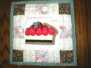 ・キルト交換会に参加した作品です。20cmX20p。季節が春だったので、苺と春っぽい生地を選んでみました。今までがサイズがずれても適当に合わせちゃっていたんですが、今回サイズが20pX20pと決まっていて、その通りに作ろうと思うのですが、パッチワークや、キルティングで縮んでしまって、キルトの難しさを体験しましたねー。