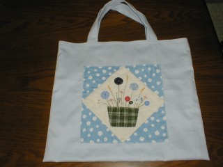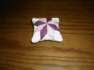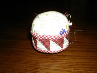 ・パッチワークの本に載ってたイラストが可愛かったので、それをまねて作ってみました。底があるのでどっしりとしていて転がらなくていいかな。布はソーイングケースとお揃い。背が高いので、深く刺しちゃうと針が中にもぐっちゃうのは問題だ。大きさが始めの予想と違っちゃって3回ぐらい縫いなおして大変だった。中身は、針が錆びないように、羊毛と削ったろうそく。
