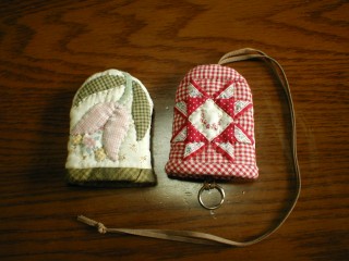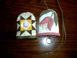 ・鍵が隠れるサイズでということで、適当にデザインして作りました。小さいので、パッチワーク、大変でした。これも、右のは交換会に出したんですけど、吊るすようにしないと使えないので、小学生の女の子でもいないかぎり使わない代物だったかも。