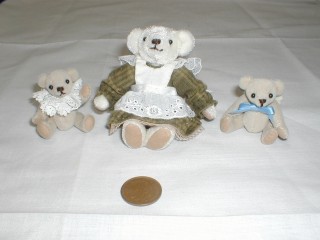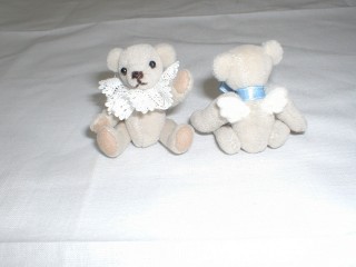 ・素材 ミニチュアファー、化繊綿、レース、木綿、3oの丸いビーズ ・両脇のくまについては下で説明します。真ん中のくまは、白いミニチュアファーで作りました。伸長は10p。ちょっと耳が大きくなってしまいました。写真では見えませんが、ワンピースの胸と裾にピンタックが入っていてちょっと凝っているのがポイントです。 ・作成日 2003年1月16日(ワンピースは18日) |