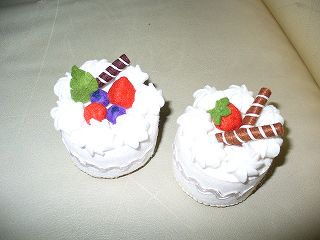 ・素材 フェルト、化繊綿、他 ・幼稚園の母親の会で作りました。クリームがリアルで気に入っています。2つ作りましたが、他にも作りたいと思っています。はてさて、他にも作りたいものがあるので、いつ作れることやら。クリームを型紙を写してカットするのが大変でした。 ・キット tama* te *bako ・作成日 2006年2月21、24日