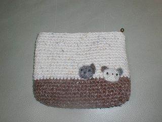 ・素材 毛糸、布、ファスナー、他 ・これもアレンジ。今回は丸ではなく楕円に編み始めて、ポーチにしてしました。で、ねこを編んでアップリケ。教えてくれた人のねこのストラップがかわいかったのでやってみたんだけど、私が編むとかわいくなくて大失敗・・・。悲しい。 ・作成日 2006年3月21日