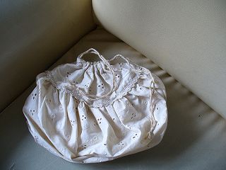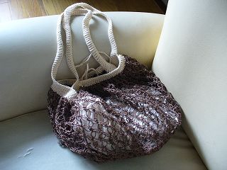 ・素材 麻糸、レースコットン、 ・HPで作り方を見て作りました。七宝編みという変わった編み方で作ってあります。編み目の感じが気になって何度も編みなおして大変でした。中の袋はレースコットンで作ってあります。レースの生地がお気に入り♪もち手とふちはリネンの布で作るようになっていたんですが、私は麻の糸で色を変えて編んでみました。編み方は適当。 ・作成日 2006年5月5日