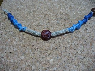 ・素材 ヘンプ、カーネリアン陰陽ビーズ、他 ・お友達に教えてもらって作った輪結びのブレスレット。カーネリアンのビーズは陰陽図柄が彫ってあります。穴に糸を通すのが大変でした。輪結びは簡単で楽しかったです。見てもらうとわかると思うんですが糸の色を左右で合わせてあります。うまくあったのでうれしかったです。 ・参考図書 「麻で結ぶヘンプアクセサリー」 ・作成日 2006年5月25日