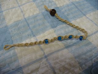 ・素材 ヘンプ、マクラメビーズ、他 ・細めなので着けやすいと思います。本で見て作りました。編み方はねじり編み。途中でマクラメビーズを入れてあります。マクラメビーズは大きめなビーズで穴が大きいので麻の糸もらくらく通ります。青いガラスの色がとてもきれいでお気に入り。。