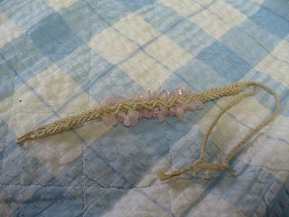 ・素材 ヘンプ、ローズクオーツの細石 ・本ではシェルビーズを使っていて生成りの麻の色と白のコントラストがきれいだったけど、手に入らなくってローズクォーツを使ってみました。ローズクォーツが優しい色なのでこれも結構合うかな。私は気に入りました。編み方が難しくってはじめは何度も編みなおしして、ようやく編みあがりました。 ・参考図書 「天然素材ヘンプで作るシンプルアクセサリー」 ・作成日 2006年5月27日