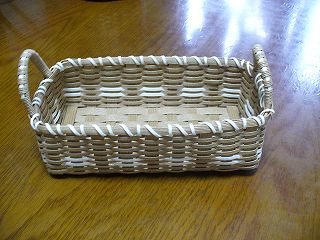 ・素材 クラフトテープ ・母親の会でみんなと作りました。テープを切るだけで1日が終わってしまって、2日目に編み上げました。みんなで材料を分けたので、これで材料費100円。とってもお得。さて何を入れようかなあ? ・参考図書 エコクラフト手芸 ・作成日 2006年7月19日