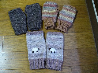 ・指の分を編まないので私でも編めました。ここにも3つありますが、友達や、子供の分もいくつも編んじゃいました。1玉あれば編めるのも魅力。