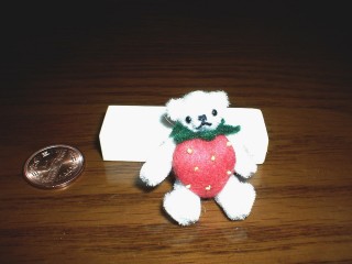・素材 ミニチュアファー、フェルト、化繊綿、刺繍糸、他 ・いちごのくまさんは、ボディが苺という変則的なくまさんです。この子は頭がもう少し大きい方が良かった気がします。ブローチにしてもいいらしいのですが、うちの子はそのままです。5cm無いくらいで、小さいです。 ・参考図書 テディベアが好きだから ・作成日 2003年3月2日 |